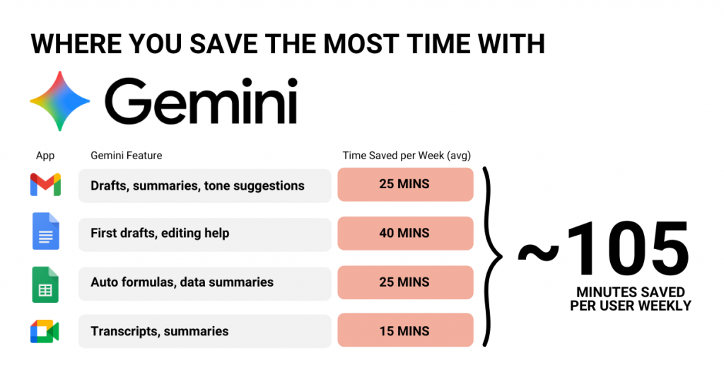 Finally, we can put all this busywork to an end. Google Workspace now includes Gemini AI across every tool your team already uses: Gmail, Docs, Sheets, Slides, and Meet. Companies already report saving 105 minutes per week per person. That’s nearly two hours returned to every employee, every single week.