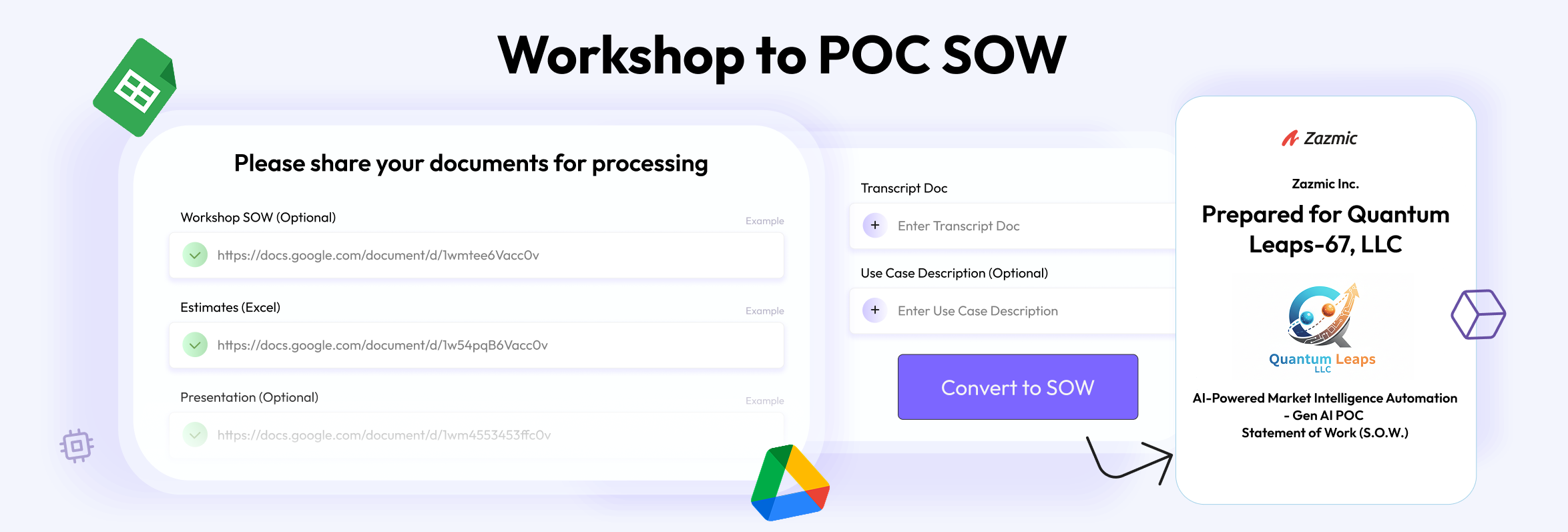 Zazmic’s project management team frequently engages in solution workshops with clients, which are a crucial step in defining project scope and deliverables. However, the subsequent process of creating a formal Statement of Work (SOW) was a manual and time-consuming task. It required PMs to sift through various documents—including meeting transcripts, estimate spreadsheets, and presentation slides—to extract and synthesize information into a coherent document. This process was a significant administrative burden and a bottleneck in the project lifecycle. To address this, an internal project was initiated to leverage Zazmic’s expertise in generative AI to create a tool that could automate this critical workflow. The goal was to build a sophisticated solution that could intelligently process unstructured data and generate accurate, consistent SOWs with minimal human intervention.